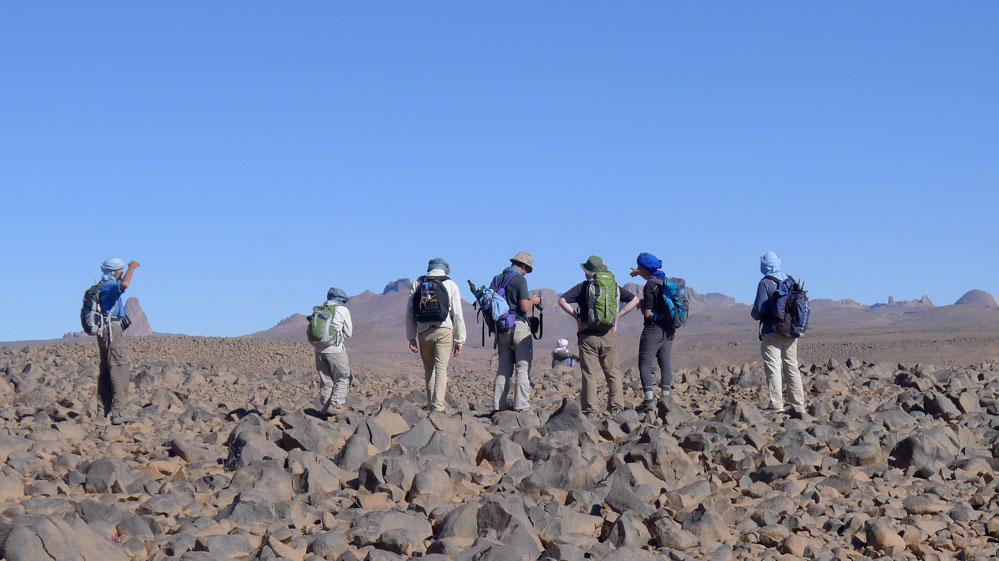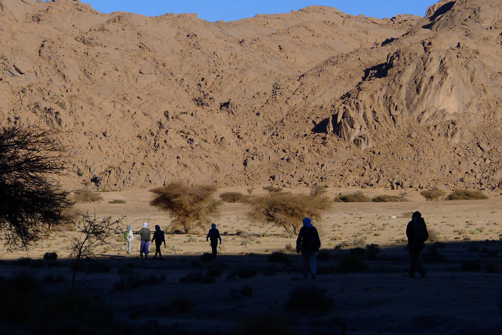 The odd staging, with early or very long lunches also took some getting used to. We concluded that we were following an easy, ‘starter’ circuit aimed at recently flown-in tourists, and not hardened desert vets like us. The glum crew, dearth of firewood, occasional rubbish and car tracks, plus the sometimes bleak surroundings took the edge off the walk, but as a well-bonded throng, we took it all without complaint because it sure was better to be walking out here in the Hoggar than most other things.