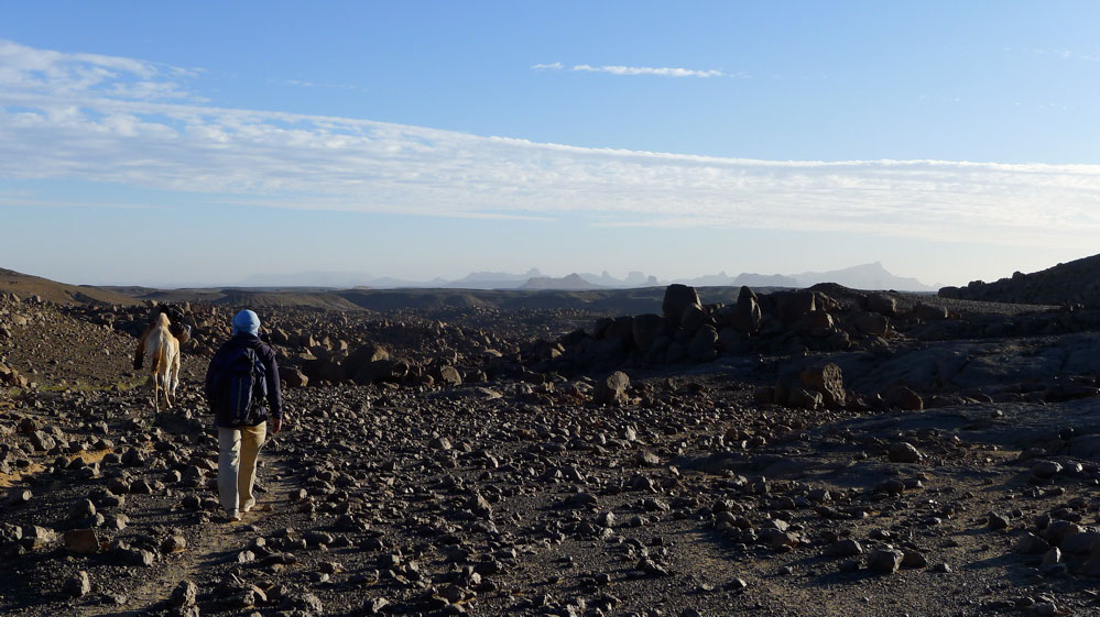 Another great morning led us through the boulders to Akar Akar mountain to cross over the car track and get back inside the Hoggar ‘loop’. Steve had chosen to ride a camel that morning, little did he know he would be sat on the acacia plank till lunchtime, but when we caught him up he was fine. To the south lines of cones marched across the horizon in the blue haze and by mid-afternoon one more basalt rubble ascent and descent brought us above the last oued camp near the distinctive cone of Adaouda where Patrick found a fine Tuareg dagger while looking for fire wood.