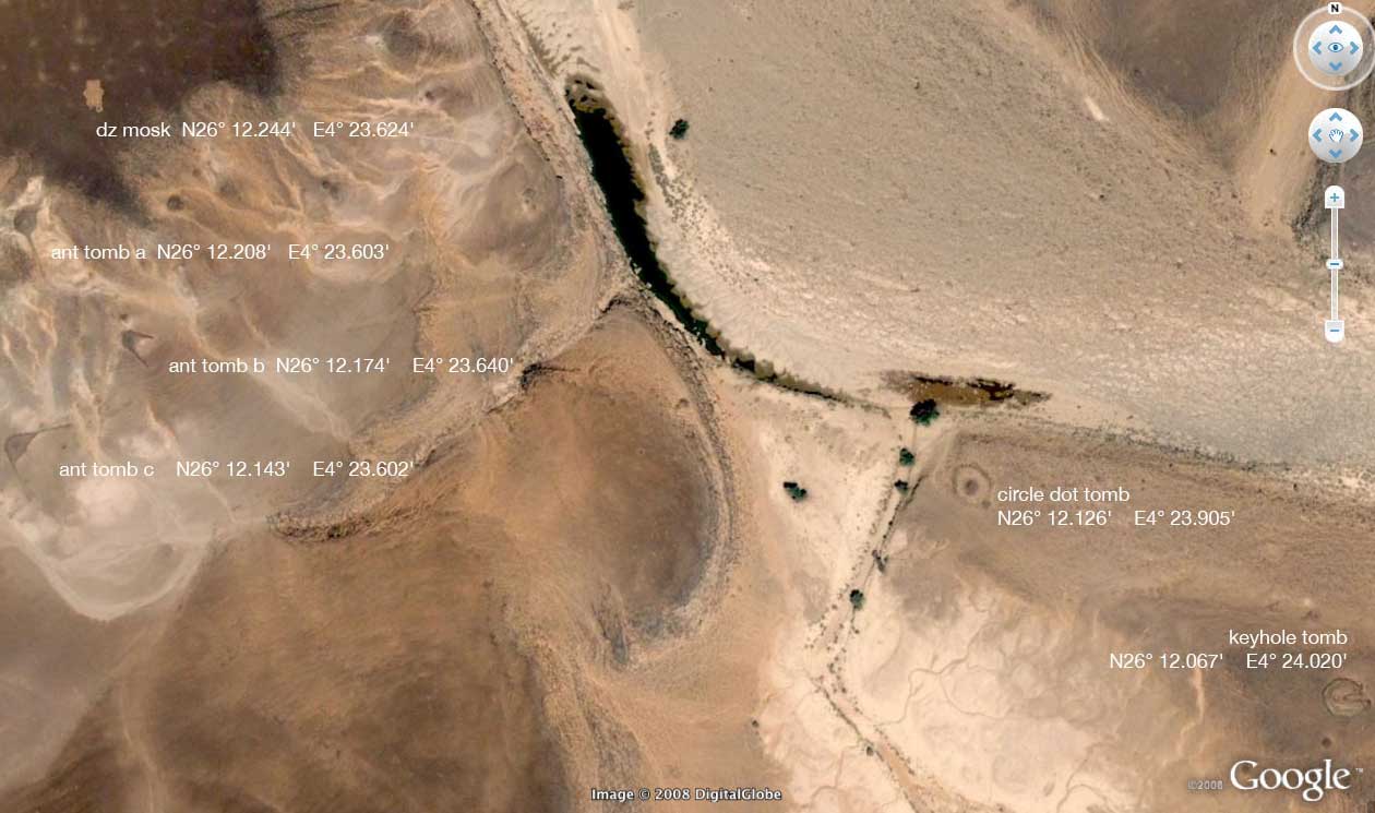The following day we emerged from the Tafrakerk canyon at Aguelmam Rahla guelta (right) where we were in a little too much of a rush to wash off the dust of several days, much to the displeasure of Mohamed. He was quite right, we should have filled up and taken a bucket elsewhere, this waterhole is a key point for nomads topping off their goats prior to collection by Arab traders coming in from In Salah, two days drive northwest. A mile away, the terminal dune of the Erg Teganet (right) made a great backdrop to our camp as well as a challenge for some next morning, while I wandered around looking for the tombs I recalled seeing clearly on Google Earth a while back (left). More on tombs here.
