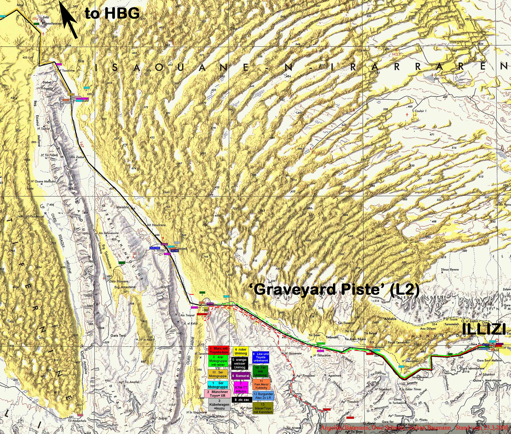 This also happened to be along the approach route to the crater we’d planned on Desert Riders back in 2003, going as far as leaving a fuel and water cache at Foum el Mahek gap to the east a year earlier (see map, right). That trip did not end so well, but having now walked up it, I’m not so sure riding the lardy Honda XRLs would have been at all easy up here.