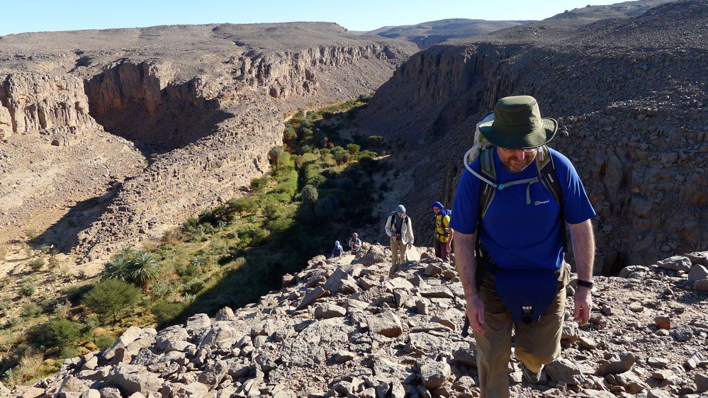 Next day I asked to Mohamed, our genial 72-year old guide, to visit the impressive three-tiered gueltas (rain-fed waterhole) we’d lunched at in 2007, but which had been skipped by subsequent guides. On the way there ‘Rick’ lost us while engrossed in the manual of his new Nikon Tankbuster, but did the right thing by getting onto high ground and was back on our trail by the time Moh had backtracked to find him. The same had happened to me hereabouts a tour or two ago when I’d stopped off and ended up chasing half-burned toilet paper in the breeze. Now Rick also knew that chilling feeling when you lose sight of the group, any trace of their tracks, and haven’t got a clue which way is up.
