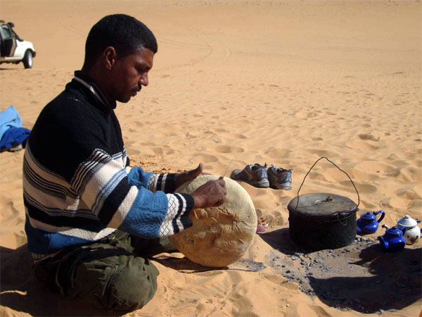 Tanezrouft Voyages The invitations, permits, two Toyotas (for the Djanet to Tam leg), drivers and guides necessary for an Algerian trip these days were all arranged by Tanezrouft Voyages. Our itinerary was complicated. It included two arrival dates for our party, one in our own car, three departure dates and several unique groups of names for the various legs (two arriving in Taleb Larbi, one leaving in Djanet, 8 arriving in Djanet, 7 leaving in Tam, 2 leaving in Taleb Larbi!). The paper work was taken care of by Yves at Tanezrouft and any changes, including a few that we had to make late in the day, were resolved very promptly. The Tanezrouft drivers (Dahaj and Moktar) were the best you get for these kinds of trips. Their outlook and temperament are very well suited to desert driving and desert trips. They obviously enjoyed being in the desert, were ever patient and unhurried, good with the kids, and sensitive to us wanting to drive slowly and take ages over the piste from Djanet to Tam. They were not once late. Srouffi, the guide provided by Tanezrouft, stayed with us from Taleb Larbi to Tam. Srouffi is a lovely man who knows the pistes extremely well. He went the extra mile in looking after us in the camps, especially around the fire on cold nights. He is quite a character. Overall it would be a priority for us to work with Tanezrouft on our next visit to Algeria.