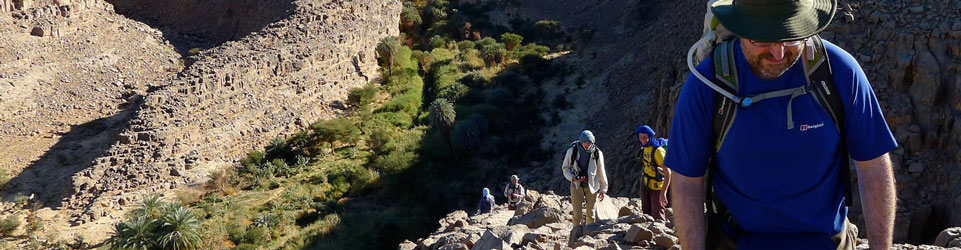 Next day we tried to climb Tazat mountain (2165m), but things got as complicated as they looked near the summit, so we satisfied ourselves with some low-angled shots that looked as good. Far below, ribbons of oueds rolled off towards the hazy horizon and the portly Tojo was but a speck. A smashing picture Nimbus took out there turned out to be the cover of the blue edition of Sahara Overland.