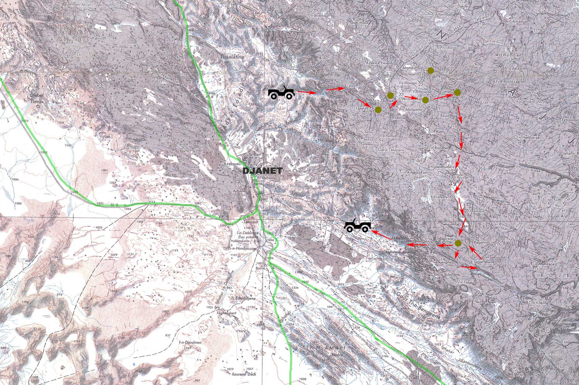 The border area here is annoyingly off the edge of the Agadez and Tamanrasset IGN maps and with no waypoint we just headed north following tracks. We ended up missing the border post and drove straight into In Guezzam unchallenged. With the help of a local we tracked back the 10 or so kms and found the checkpoint (N19° 28.9 E05° 47.5).