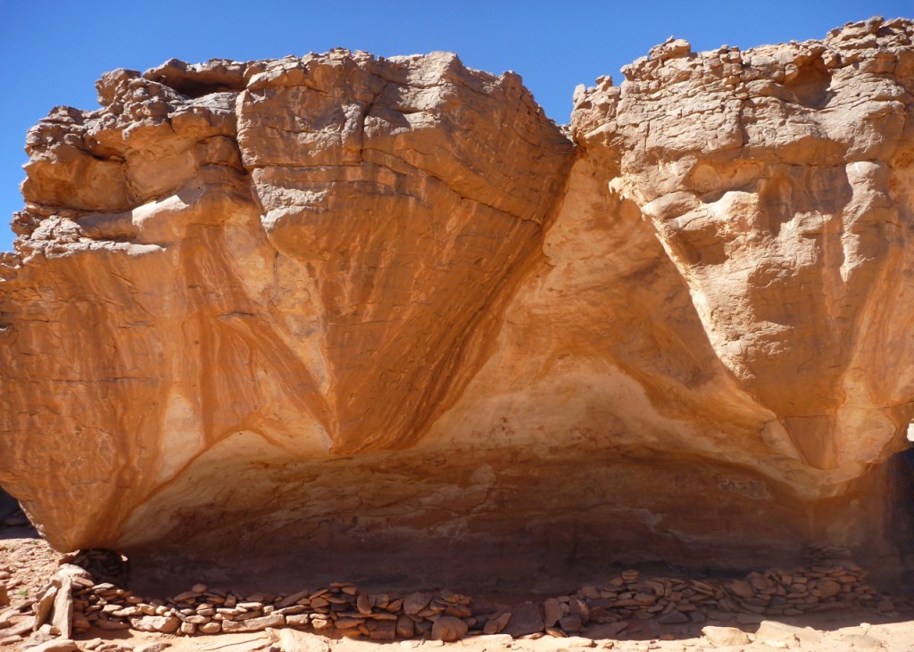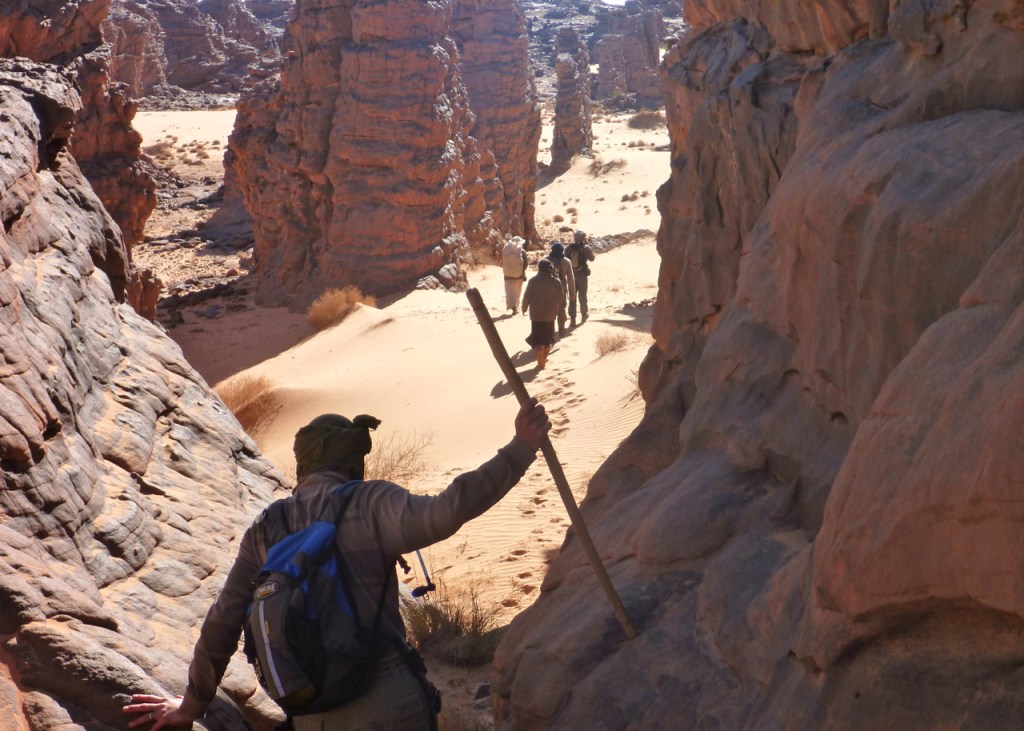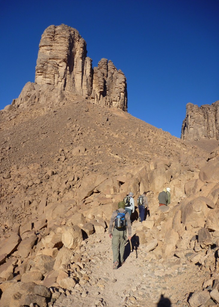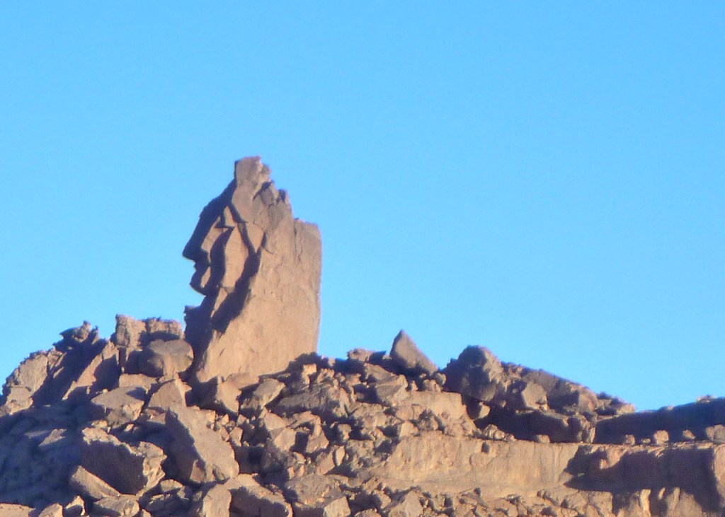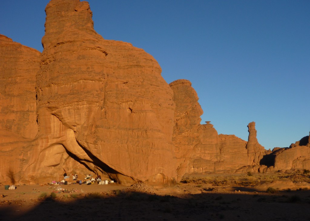 Short of time we got the Zeriba to organise a one day walk on the Tassili Plateau to Jabbaren, supposedly the second most important site of prehistoric rock art (5,700 AD for the two of us with a guide). The walk was beautiful and if you are time-constrained, there is a lot of art in a small area. One day was manageable – we left at 0600 and were back by 1730, tired but certainly not shattered. We didn’t want to spend another night at the Zeriba so camped in the dunes just outside Djanet.