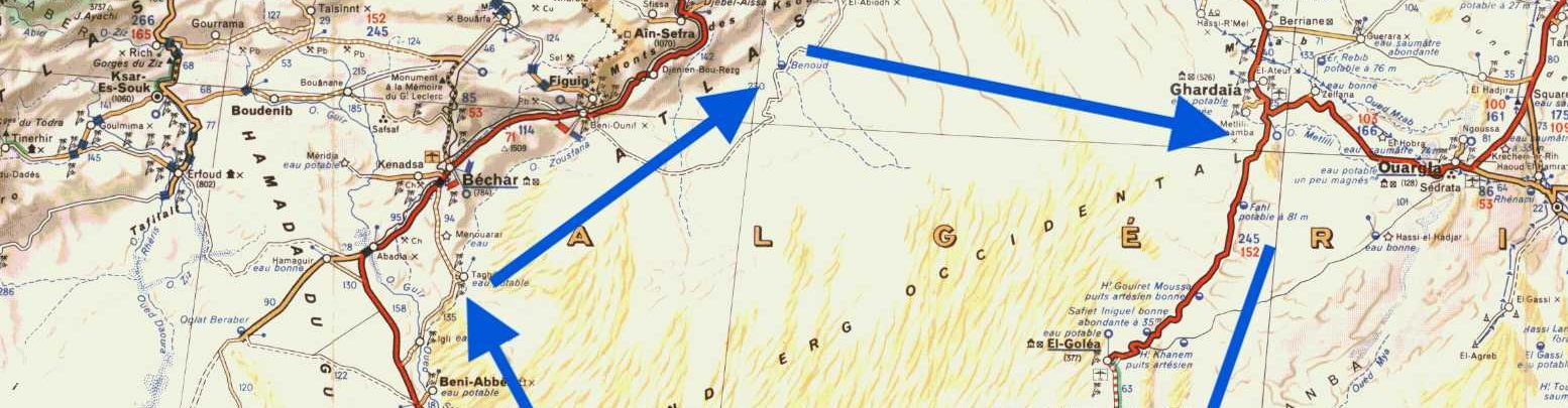Tunis – Hassi Messaoud – Quatre Chemins – Illizi – Fadnoun – Afara junction – Tazat – Djanet airport – Tazat – Toukmatine – Erg Tiodane – Amguid piste – Foum Mahek – Sli Edrar – Arak – TSH to Tam – Taghera – Erg Killian – Monts Gautier – Balise Line – Djanet airport – Fanoun – Erg Bouharet (Desert Driving base camp)