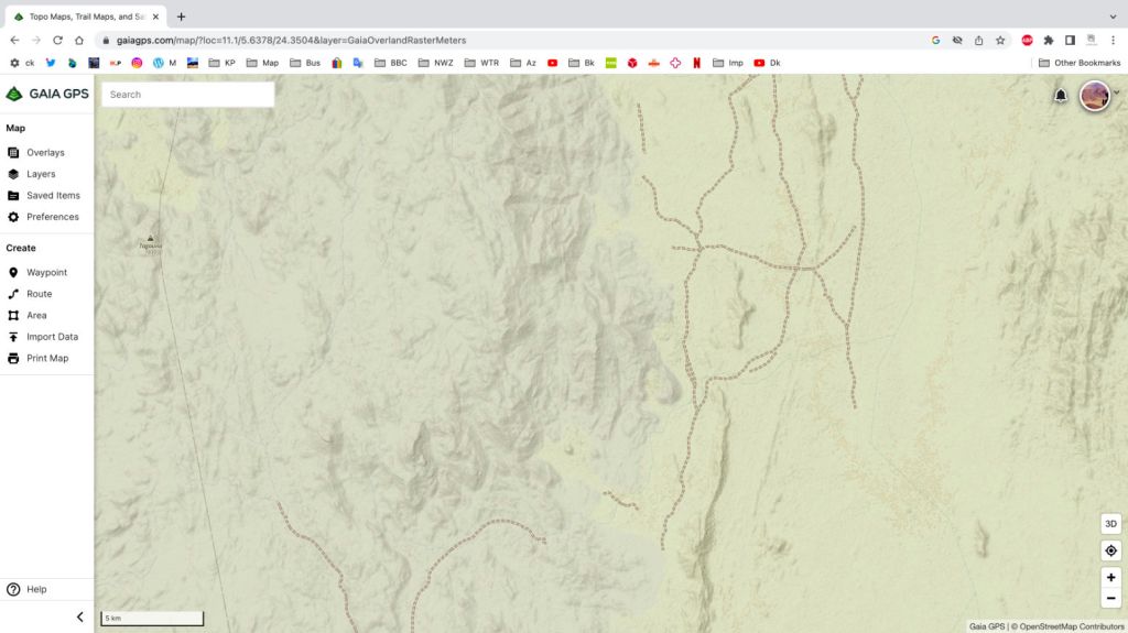 I chose the promisingly named. OSM-like Gaia Overland (metres) and World Imagery (© ESRI) satellite (find it under the ‘Hiking’ tab. I know ESRI often trounces Google in the desert). The other three sat imagery options looked less good. Sat is the layer you might want to zoom in on because, as mentioned above, the topo maps won’t be WYSIWYG, just an array of tracks added by OSM contribs with an inevitably sketchy hierarchy. The track you want may be in there among the clutter.