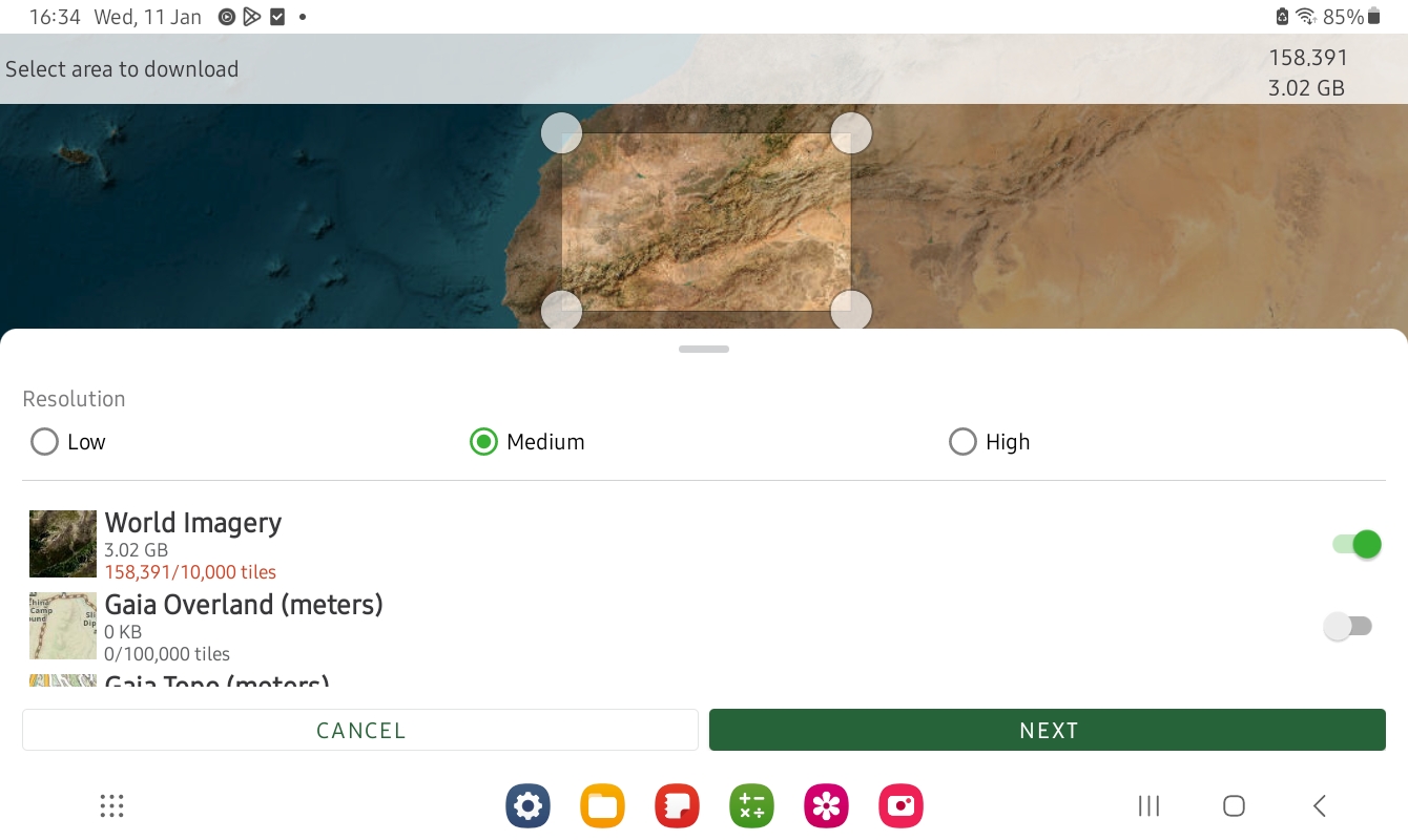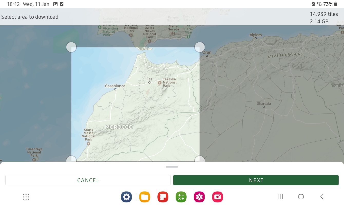 Then choose what maps you want to download so you can use your device offline in the hills. That is they key. Tap the ⊕ icon top right, choose ‘Download Map’, select a rectangular area and import, ideally into a folder if you plan to have loads of maps. As you can see in the examples above, the whole of Morocco in ‘Gaia Overland’ is just over 2GB, while a smaller area of ESRI covering about 15% of the topo map is 3GB. Full res ESRI covering the good bit of Morocco would have been getting on for 1TB. It really couldn’t be easier.