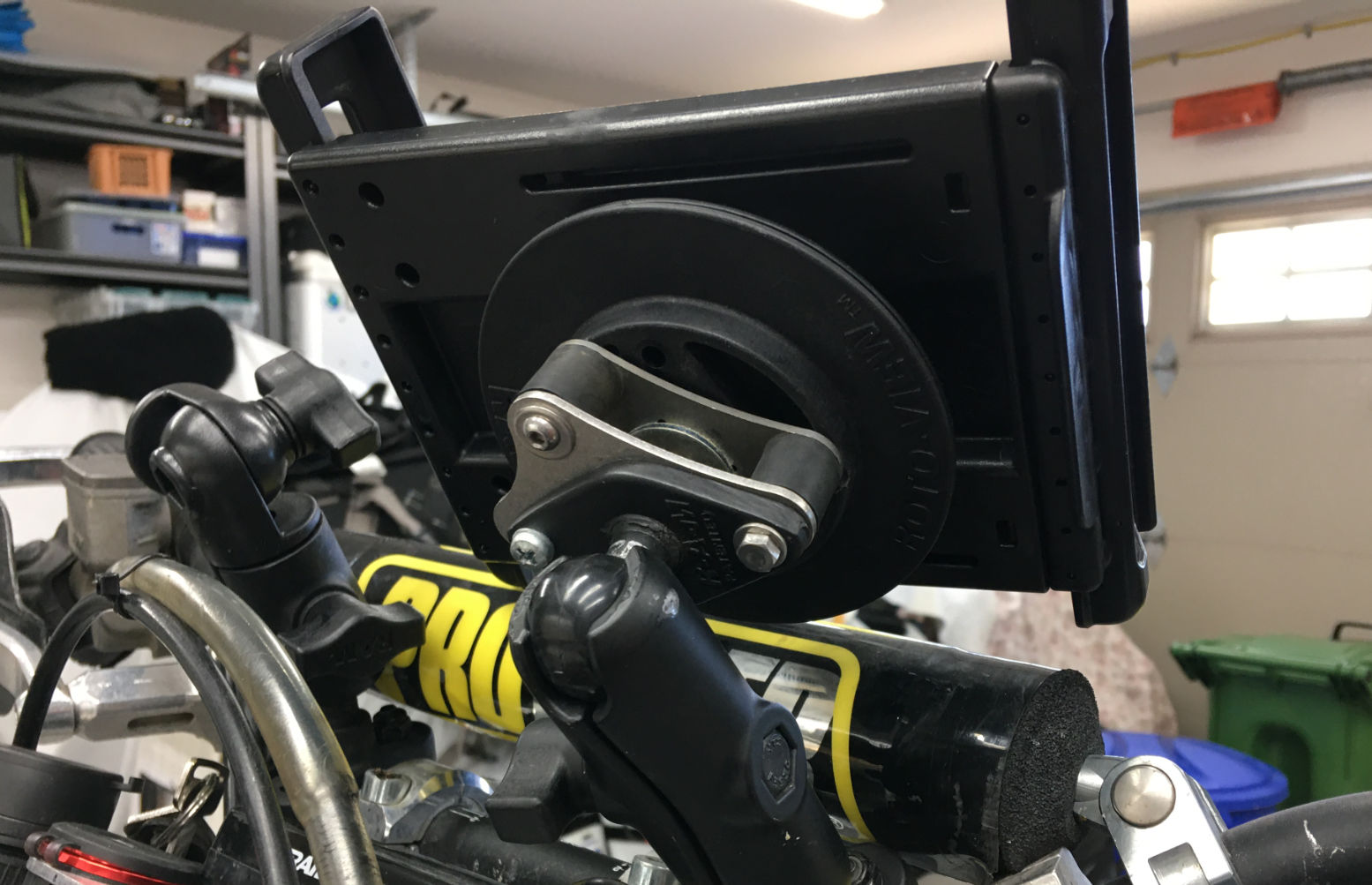 One the left, the DR400 of Grant from Horizons, based in BC: another A7 on a RAM Tough Dock mount. Grant says the unit tends to droop on rough terrain, which is why people end up with Rally towers. Waterproof cases like Otters can be hit and miss he says (this is a benefit of Garmin’s Mil-810-spec Montana), though there are ruggedised tablets, like the Carpe Iter. “It runs DMD2 software launcher, which is also available for any Android device. Their unit is also excellent in sunlight, whereas the standard tablets are crap. I’m running the software now on mine, and it’s good. It launches GaiaGPS which is what I use the most.” says Grant. I do notice it has 128GB but will only take another 128. Still on bikes, Thork Racing (see YT vids) do bike-ready mounts and even roadbook-like thumb controllers to avoid trying to jab the screen with the chequered flag in sight.
