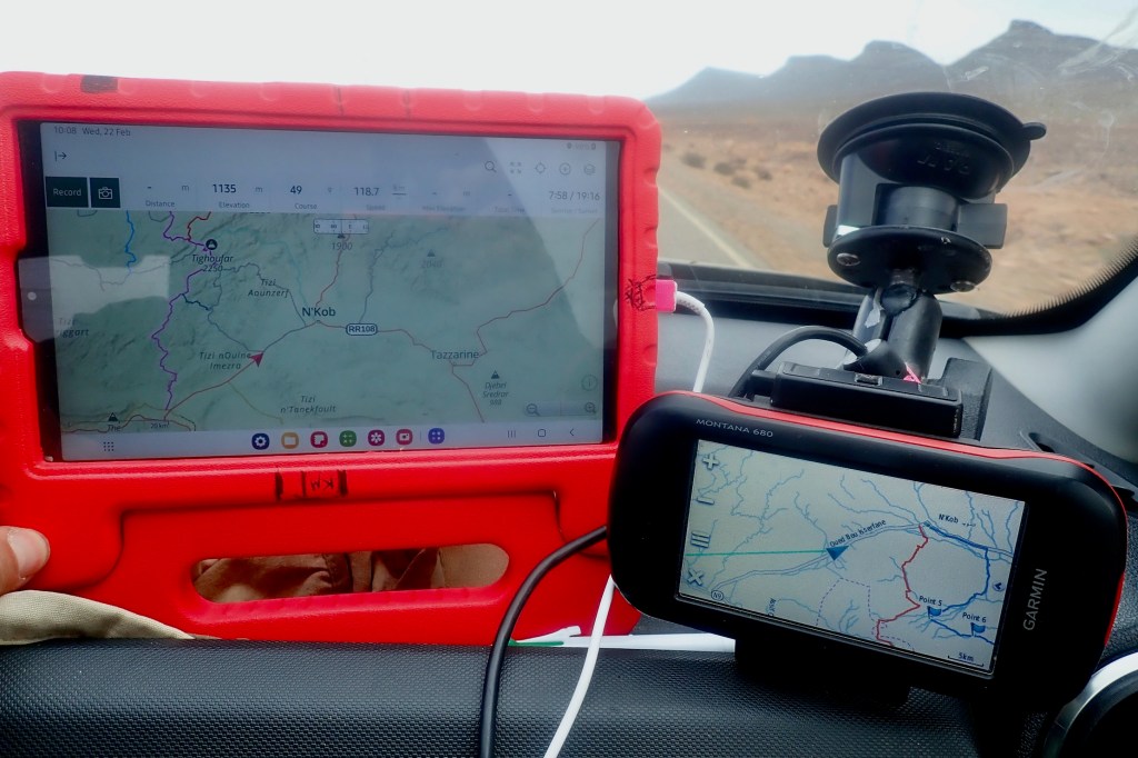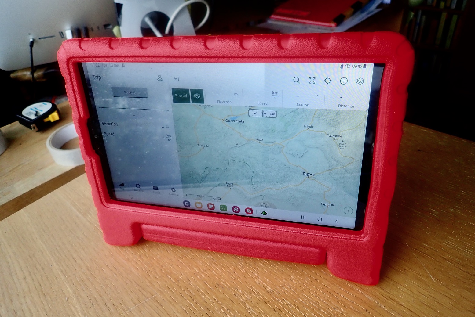 … and I was driving Duncan Barbour on a recce job in Morocco (more of which later) while he logged our convoy’s route on an iPad. I had my hands full and so assumed his setup was off his phone but in these phablet days, his SIM- enabled iPad was all he needed, along with an app like Gaia GPS. In the meantime a couple of others confirmed it was no longer possible to mirror a Garmin GPS onto a larger screen, be it laptop or tablet. Perhaps because Garmin want you to buy their 5 or 10-inch Tread series from £500 to well over a grand + subscriptions.