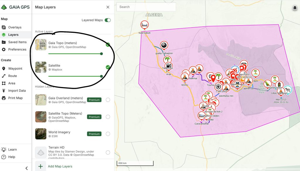 Anyway, even with the on and off lifting restrictions on overlanding in this part of Algeria, such maps will still take forever to be completed with genuine tracklogs while the IGNs show it how is was (and still is). But with Gaia GPS Premium it’s also possible to download high-res WYSIWYG satellite imagery to use offline (see bottom of page). Plus there’s nothing to stop you travelling with paper IGNs or similar, or scan of them on your device.
