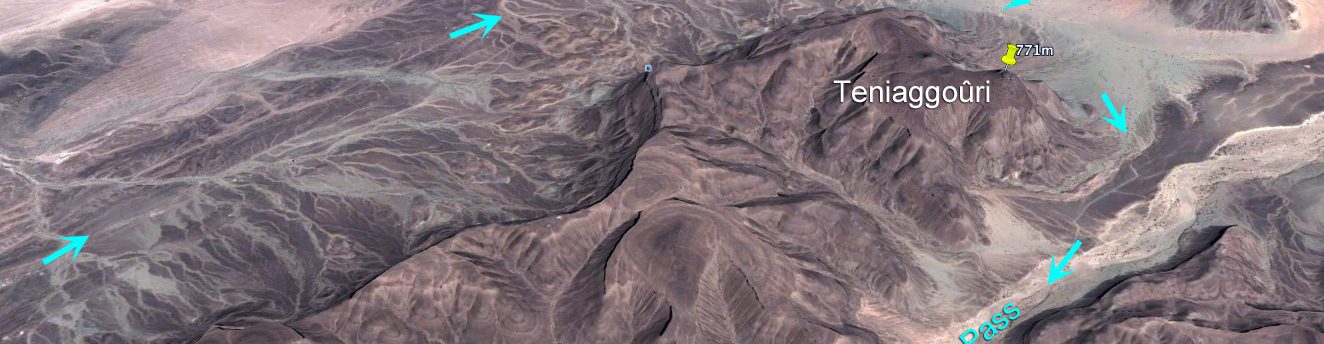 But the pesky djenoun were still trifling with us. We proceeded to spend half a day pushing into dead end oueds, failing to locate the point which I stumbled on easily with my 2000 tour group, close to the mountain’s foot. We did have an actual waypoint for a base camp attainable by vehicle, but could not get nearer than an adjacent valley, 2km away, due to flood-washed banks. Two clicks was near enough though, so that evening we set off on foot over the pass with all the water we could carry plus Abdelsalaam with another waterbag on his head. Even then, I had a suspicion water was going to be an issue and when we got to the base camp waypoint we texted for another bag to be brought up. Water was low but Mohamed knew of a well on the other side of the Igharhar valley.