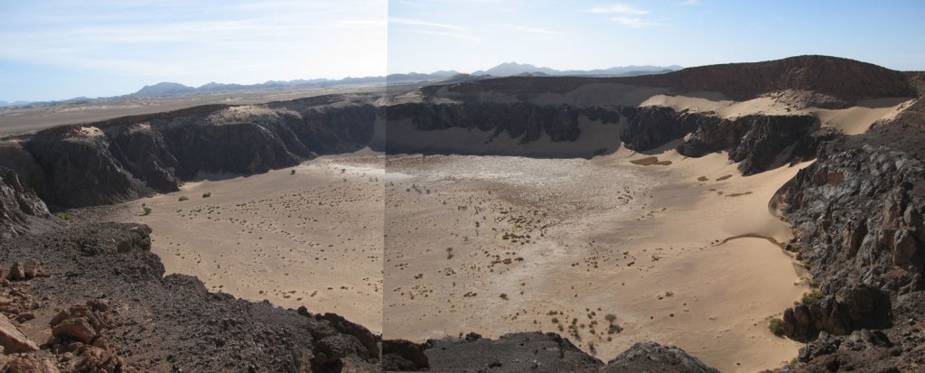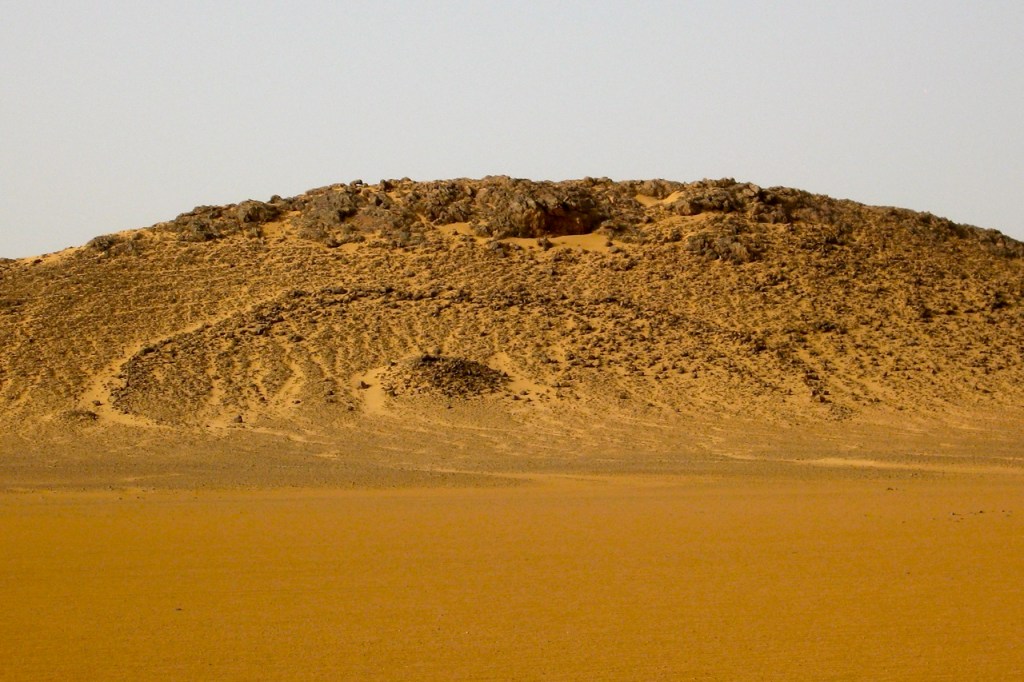 Next morning we visited a crater hill. Years ago I remember reading an article by Tom Sheppard about his quest to reach a curious crater formation he’d spotted northwest of Tam. ‘Journey to the Round Mountain‘ he called it, riding there on his XT600 Tenere. That was probably Adrar Tihaliouine to the northeast, and this similar crater reminded me of it. A good place to stash rustled camels!